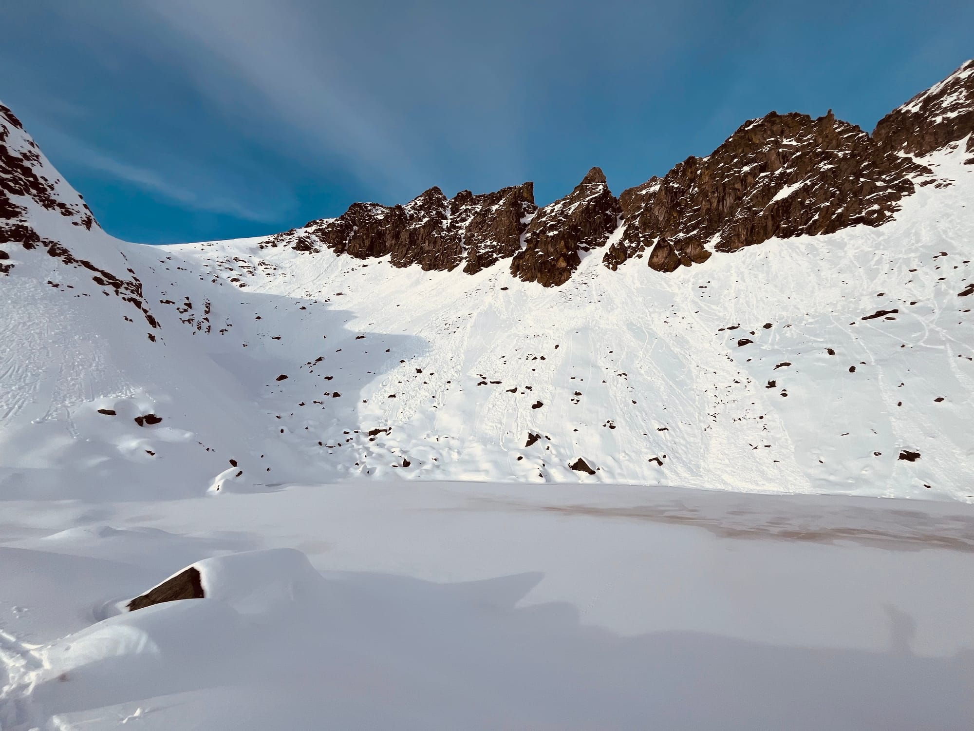 The big thing to consider if you’re itching for some turns is snow depths taper quickly with elevation. Approach trails and roads are going to be scratchy and alders will be standing tall. Seek out smooth terrain, as rocks are thinly veiled by the recent snow. All that said, there are turns to be had, but you’re going to have to walk a ways to get there and you’ll have to pay the price in P-tex on the way out.