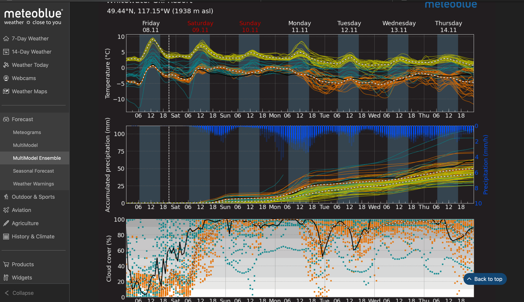 This next system should arrive relatively warm with freezing levels around 1000-1300m and slowly cool off over the week. Depending on the region there could be 30-70mm of water equivalent on its way, which could really kick riding conditions into gear. Here's a helpful link on how to interpret the MultiModel Ensemble.